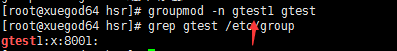 修改组使用groupmod命令可以修改已有组的GID(-g选项)或组名(-n选项)。当修改组名时,gid和组成员不变,只有组名改变,由于所有安全权限都是基于GID的,所以随变修改组名不会影响文件的安全性。下面使用groupmod –n来修改gtest组名为gtest1。