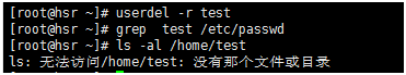 再使用userdel -r命令来删除, 没有了该用户和home目录。如下图所示: