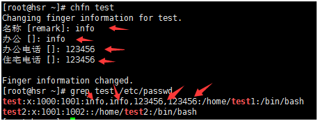(3) chfn:该命令会向你询问要将哪些适合的内容加入备注字段,下面给test用户加内容备注,如下图所示: