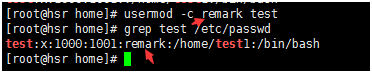 例如:使用usermod给已有test用户修改备注信息“remark”,在passwd文件中可以看到已添加的备注信息,如下图所示:
