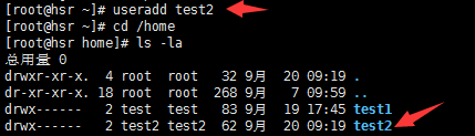 在上篇中讲到useradd命令默认情况是不会创建HOME目录,但这里没有使用-m 参数也创建了HOME目录,下面试试使用useradd不加任何参数,创建test2用户,还是会创建home目录,如下图所示。