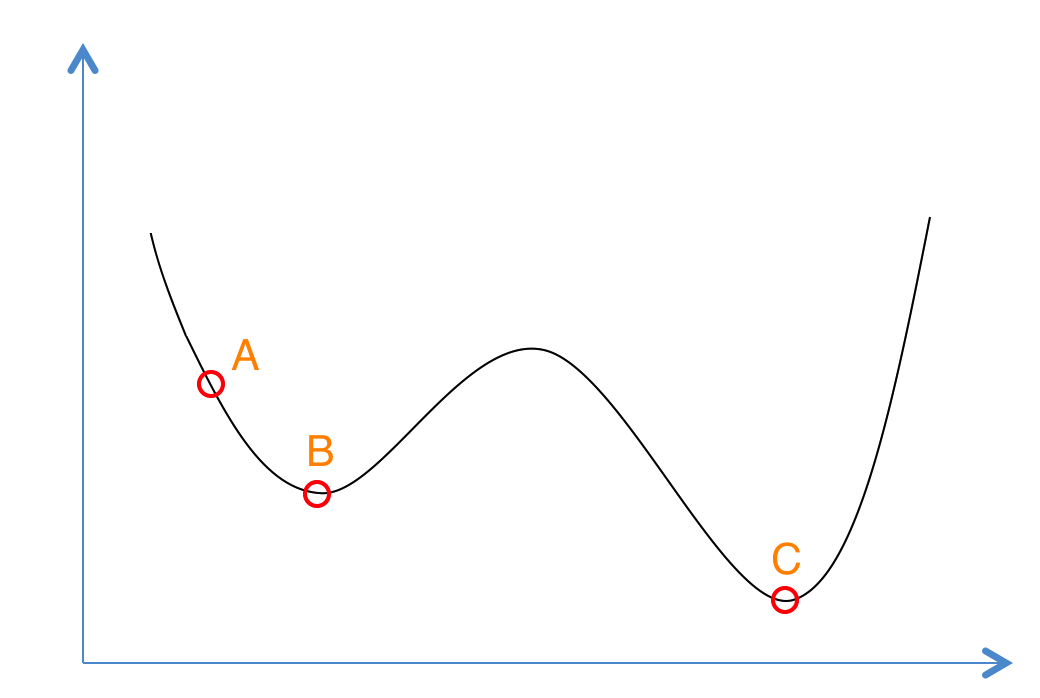 如果你对退火的物理意义还是晕晕的,没关系我们还有更为简单的理解方式。想象一下如果我们现在有下面这样一个函数,现在想求函数的(全局)最优解。如果采用 Greedy 策略,那么从 A 点开始试探,如果函数值继续减少,那么试探过程就会继续。而当到达点B时,显然我们的探求过程就结束了(因为无论朝哪个方向努力,结果只会越来越大)。最终我们只能找打一个局部最后解 B 。