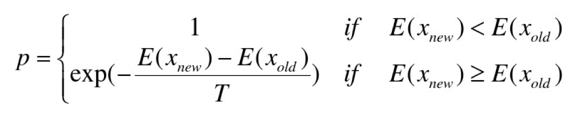根据Metropolis准则,粒子在温度T时趋于平衡的概率为 exp(-ΔE/(kT)) ,其中 E 为温度 T 时的内能,ΔE为其改变数, k 为 Boltzmann 常数。 Metropolis 准则常表示为
