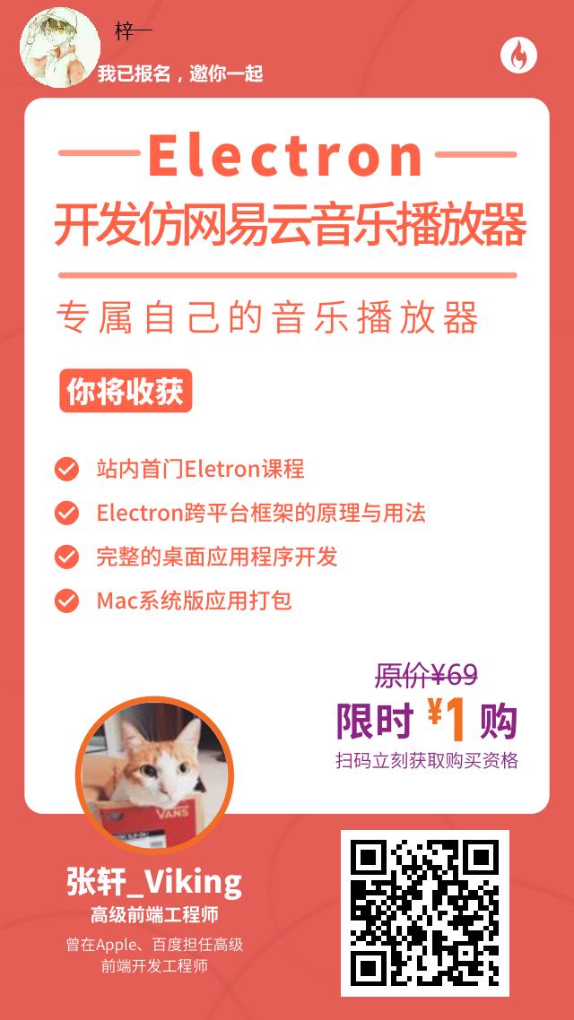 慕课网首门 Electron 课程(视频课程),仅1元,学会它,你也可以开发一款属于自己的音乐播放器!