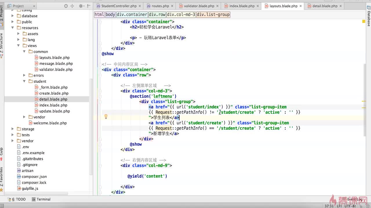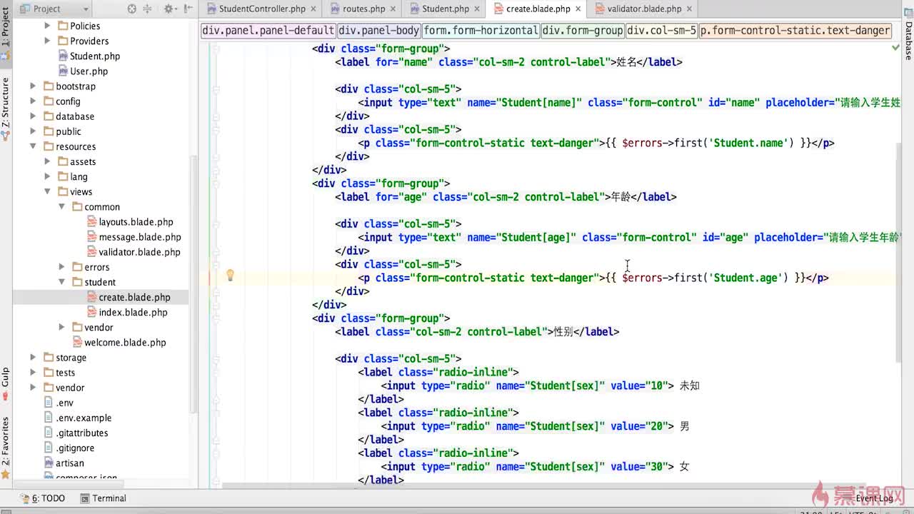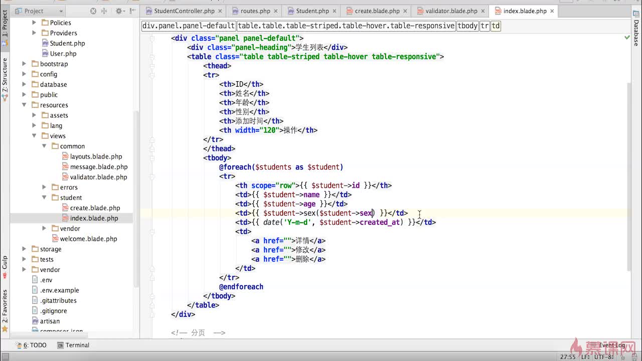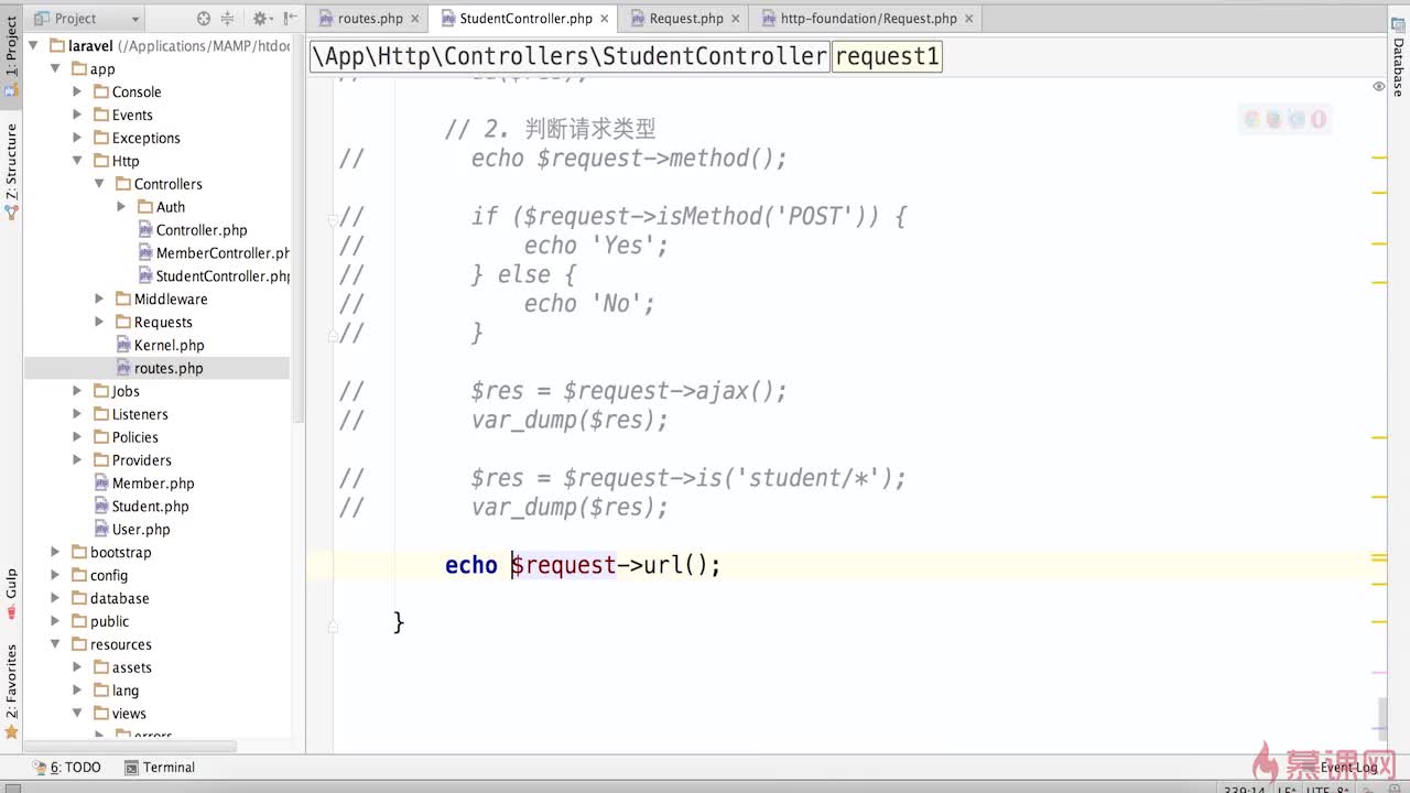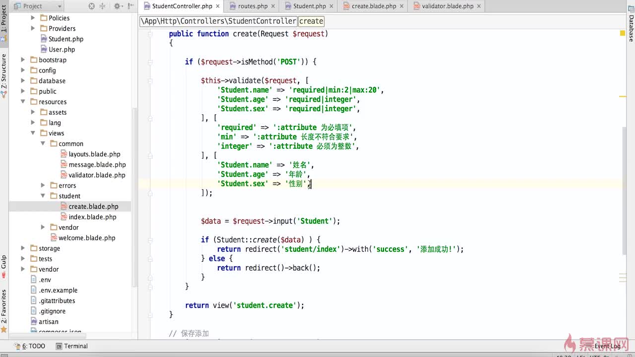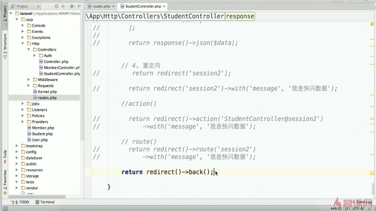 响应类型: 字符串 :直接return 视图:return view(); json:return response()->json() 重定向:return redirect()->with()带数据跳转 return redirect()->action()->with()带数据跳转至某控制方法 return redirect()->route(路由别名)->with()带数据跳转至某路由 return redirect()->back()->with() 带数据跳转至上一个页面