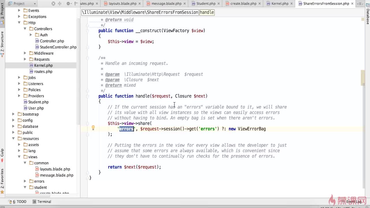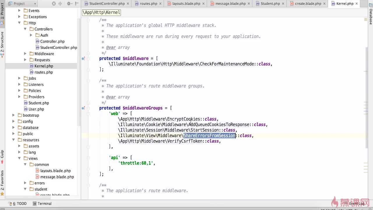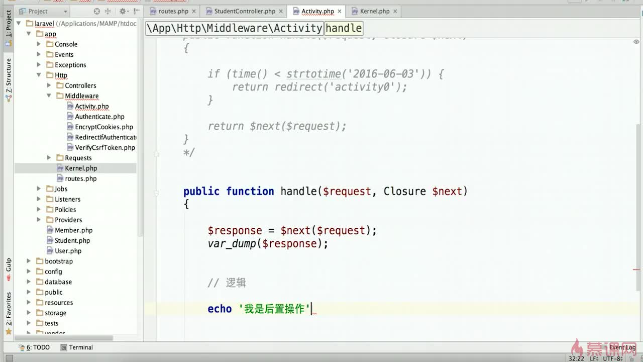 中间件操作: 1、新建中间件:手写,或artisan命令创建 2、注册中间件:在Kernel.php $routeMiddleware属性中加入中间件 3、使用中间件:路由中加入路由组 4、前置和后置操作:将$response=$next($request)置前或置后,$next是下一个操作闭包,$request是请求