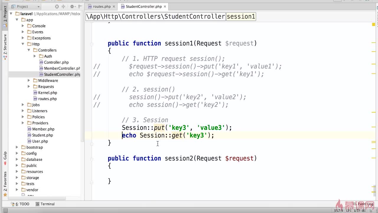session操作的三种方式: 1、$request->session()->方法 request方式 2、session()->方法 帮助函数方式 3、Session::方法 Session类方式