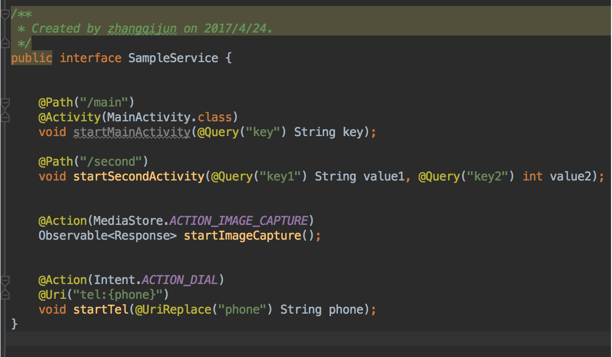public interface SampleService { @Path("/main") @Activity(MainActivity.class) void startMainActivity(@Query("key") String key);