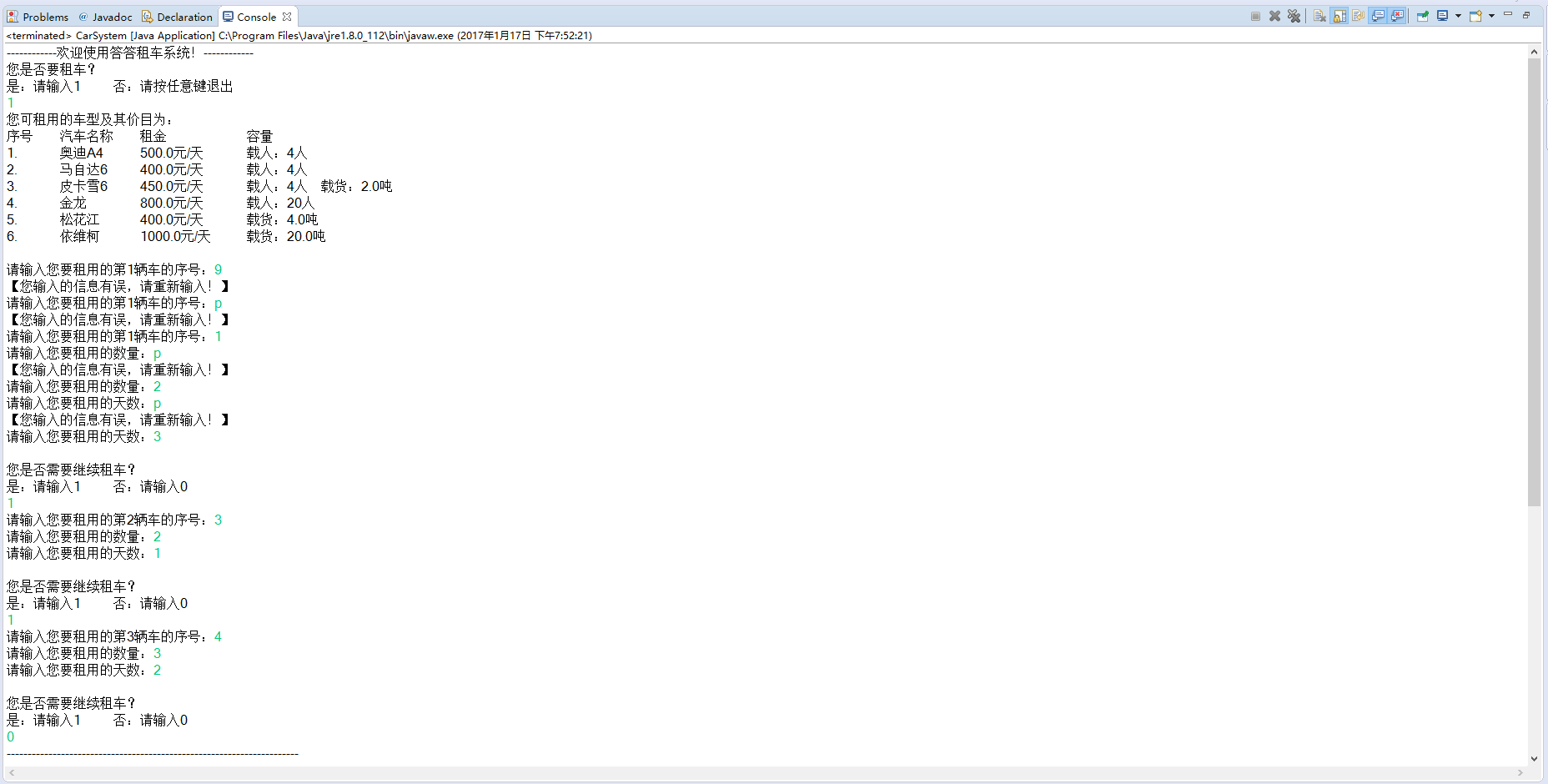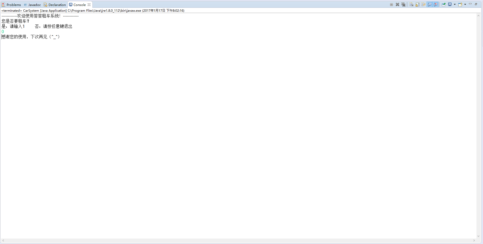System.out.println("\n您是否需要继续租车?\n是:请输入1\t\t否:请输入0");