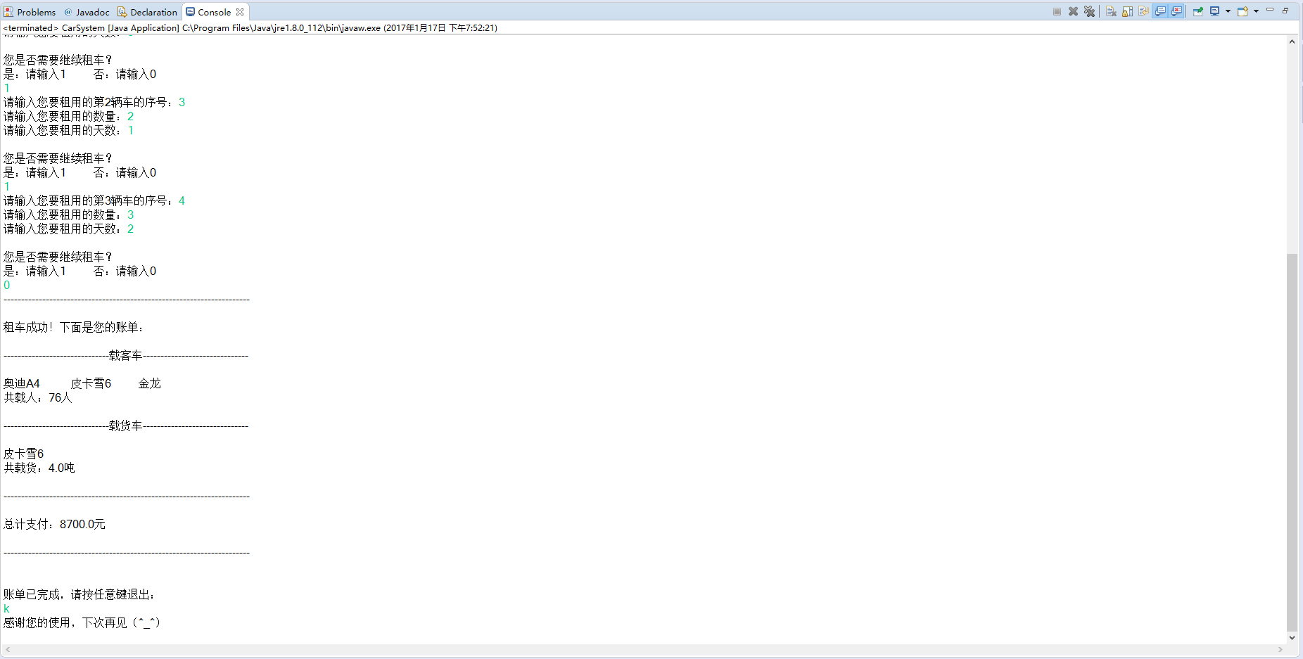 System.out.println("----------------------------------------------------------------------\n\n租车成功!下面是您的账单:\n");