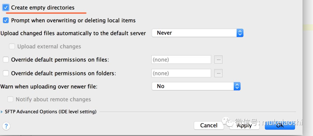 另外,建议打开Tools | Deployment | Options,将”Create Empty directories”打上勾,要是指定的文件夹不存在,会自动创建,如下: