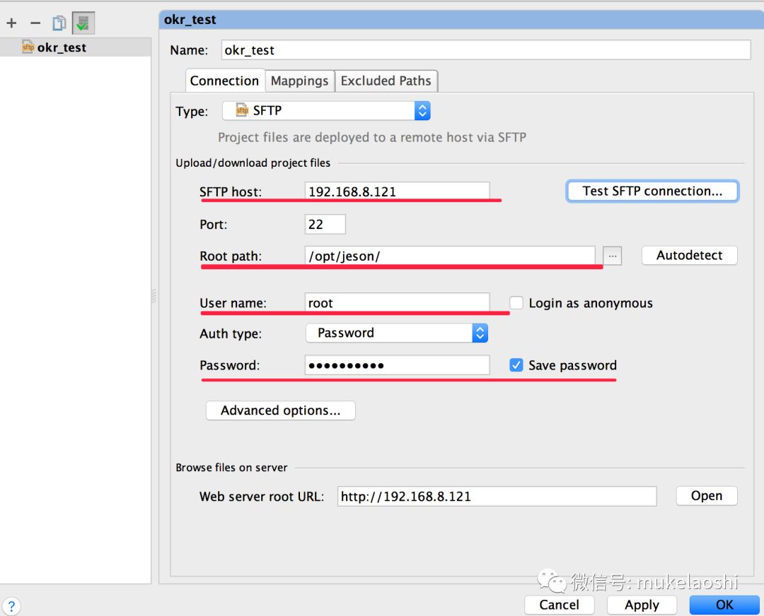 local path是自己的工程的本地目录路径, Deploy path on server 这里填写相对于root path的目录.