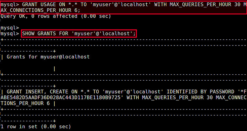 mysql> GRANT USAGE ON *.* TO 'myuser'@'localhost' WITH MAX_QUERIES_PER_HOUR 30 MAX_CONNECTIONS_PER_HOUR 6;