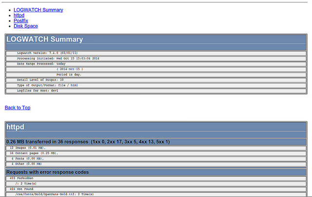 # logwatch --detail 10 --range today --service http --service postfix --service zz-disk_space --format html --output file --filename /var/www/html/logs/dev1.html
