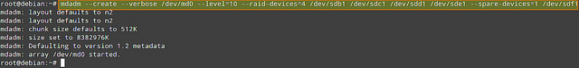 # mdadm --create --verbose /dev/md0 --level=10 --raid-devices=4 /dev/sd[bcde]1 --spare-devices=1 /dev/sdf1