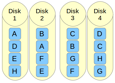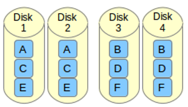 上图中的文件由A、B、C、D、E和F六种块组成,每一个RAID 1镜像对(如镜像1和2)在两个磁盘上复制相同的块。在这样的配置下,写操作性能会因为每个块需要写入两次而下降,每个磁盘各一次;而读操作与从单块磁盘中读取相比并未发生改变。不过这种配置的好处是除非一个镜像中有超过一块的磁盘故障,否则都能保持冗余以维持正常的磁盘I/O操作。