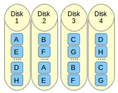 RAID 0的分区通过将数据划分到不同的块,然后执行同时将块A写入镜像1、将块B写入镜像2(以此类推)的并行操作以提高整体的读写性能。在另一方面,没有任何一个镜像包含构成主存的数据片的全部信息。这就意味着如果其中一个镜像故障,那么整个RAID 0组件将无法正常工作,数据将遭受不可恢复的损失。