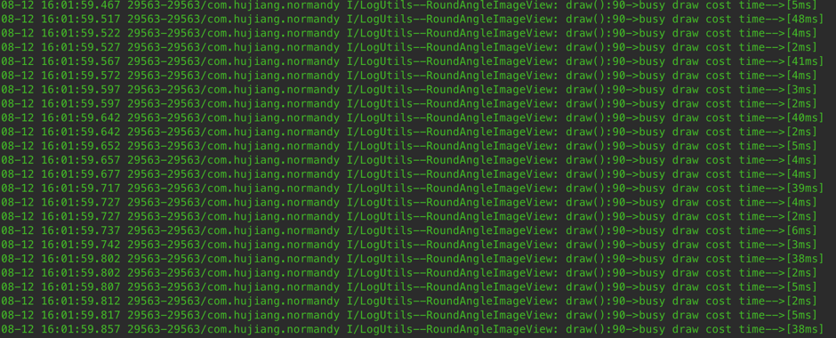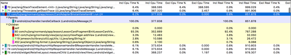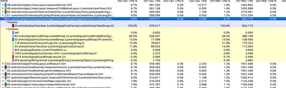 可以看到耗时最多的两个方法,RoundAngleImageView的draw方法和CardAdapter的instantiateItem方法。我们通过打log也应证了TraceView的判断,ViewPager滑动过程中RoundAngleImageView会不断绘制,在滑动停顿后又开始滑动得时候出现耗时峰值。优化的方案就是用RoundedImageView替换掉自定义的RoundAngleImageView,RoundedImageView使用BitmapShader方式优于RoundAngleImageView使用的PorterDuffXfermode圆角方案。特别在不断绘制的情况下,效果较明显。