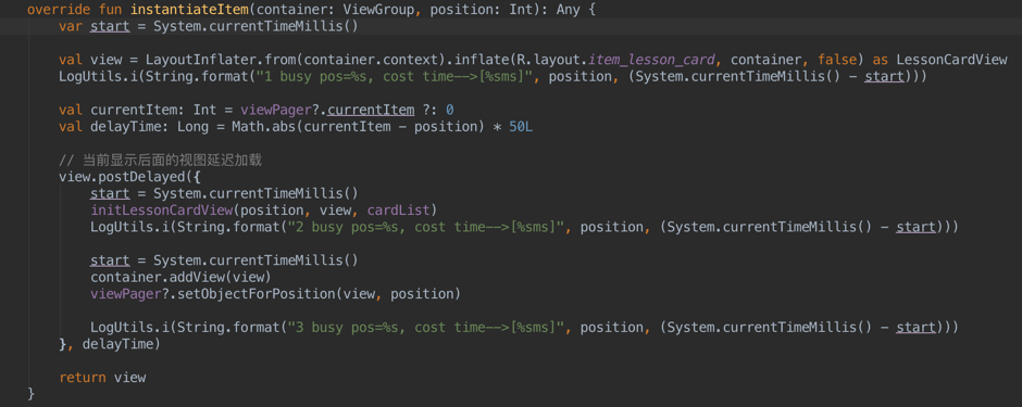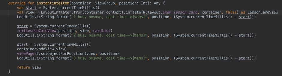 通过日志看出val view = LayoutInflater.from(container.context).inflate(R.layout.``item_lesson_card``, container, false) as LessonCardView和initLessonCardView(position, view, cardList)两个方法。