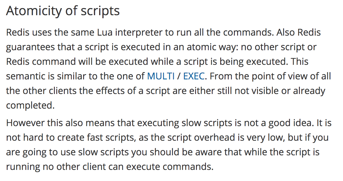 简单来说,就是在eval命令执行Lua代码的时候,Lua代码将被当成一个命令去执行,并且直到eval命令执行完成,Redis才会执行其他命令。