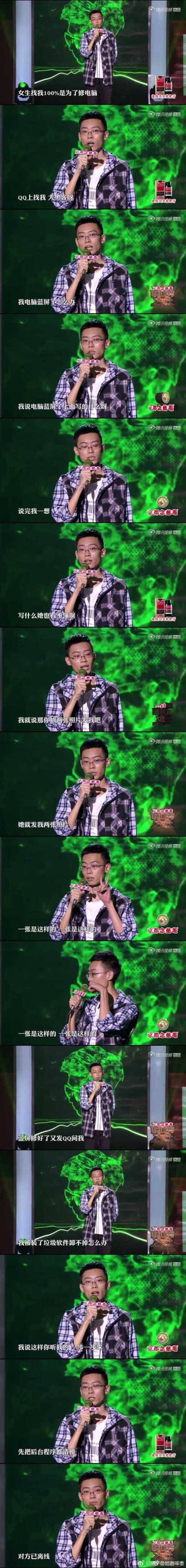 黑客哥哥实力演绎什么叫“凭本事单的身”,当然小慕相信,一个会讲脱口秀的实力派程序员,火了之后脱单难度应该不高,如果他愿意换掉格子马甲的话……言归正传,你是小张这样可爱耿直不知道怎么跟女生聊天的钢铁直男的话,那么你已经融入程序员这个圈子一大半了。