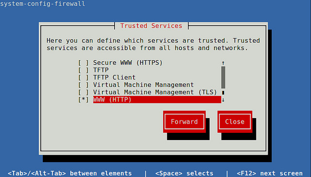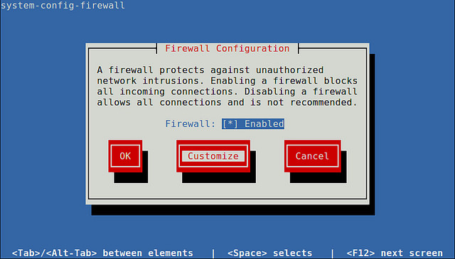 另一种方法是通过一个名为system-config-firewall-tui的命令行用户接口(TUI)的防火墙客户端。