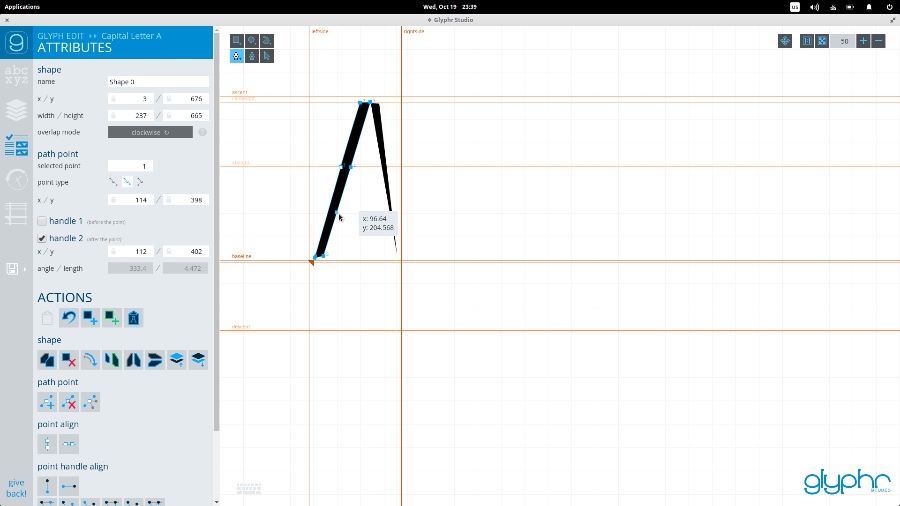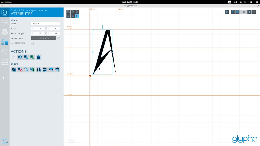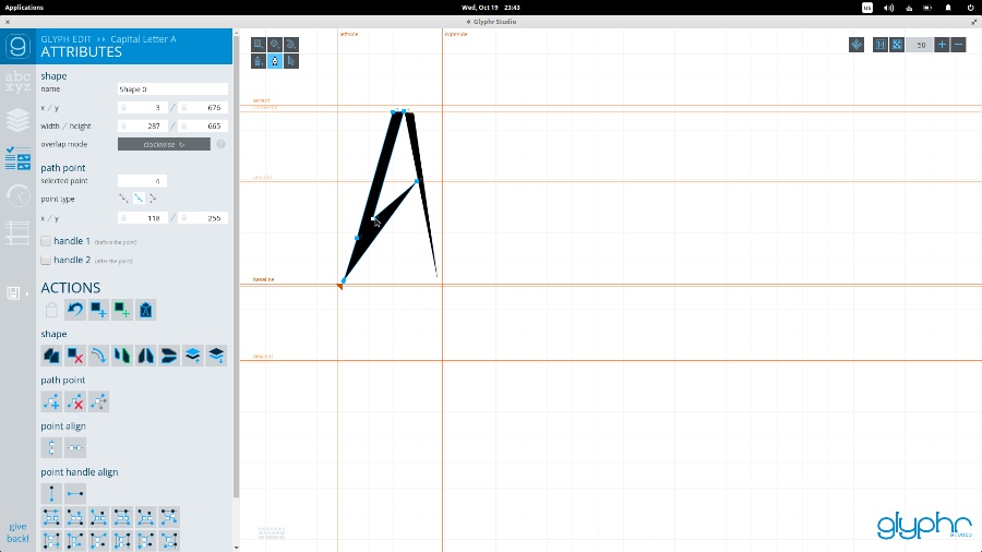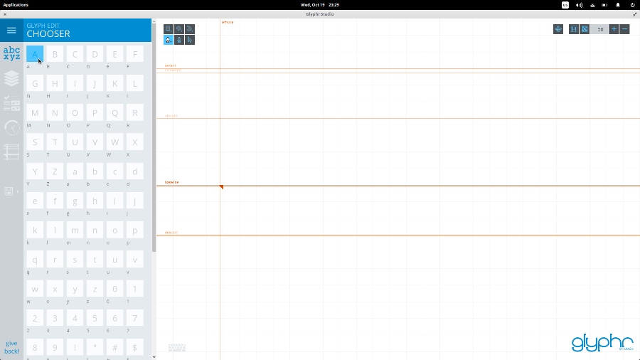 完成进入编辑界面后, 你可以从屏幕左边的面板中选择字母,然后在右边的绘制区域设计。我选择 A 字母的图标开始编辑它。
