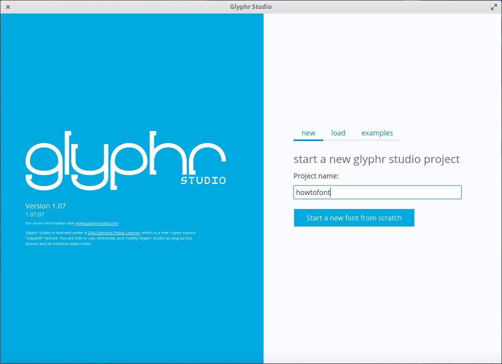 启动应用后会给你三个选项。一个是从头创建一个新的字体集;第二个是读取已经存在的项目,可以是 Glyphr Studio 项目文件,也可以是其他 OpenType 字体(otf)或 TrueType 字体(ttf),甚至是 SVG 字体。第三个是读取已有的两个示例之一,然后可以在示例上修改创建。我将会选择第一个选项,并教你一些简单的设计概念。