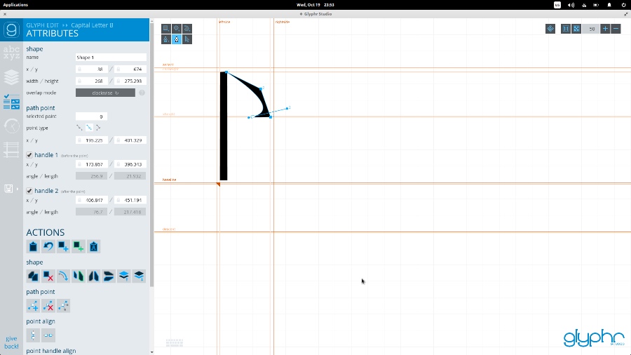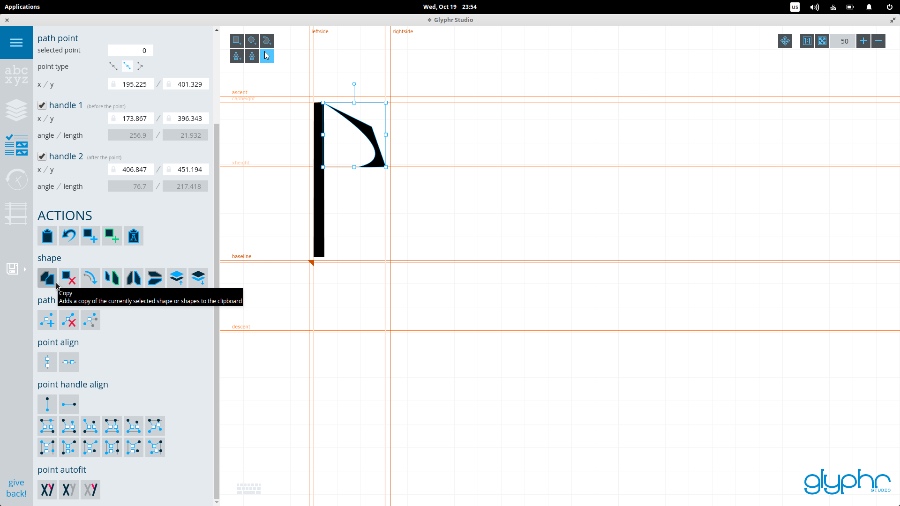 其它有用的设计动作集还有左侧面板提供的复制-粘贴、翻转-旋转操作。来看个例子,假设我现在正在创作 B 字母, 我要把已经创建好的上部分镜像到下半部分,保持设计的高度一致性。