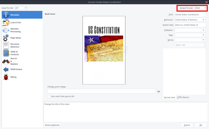 一旦这个 HTML 文件加入到 Calibre 库中,选择这个新文件并且点击“编辑元数据Edit Metadata”按钮。在这里,你可以添加下面的这些信息:标题Title、 作者Author、封面图片cover image、 描述description和其它的一些信息。当你填完之后,点击“Ok”。