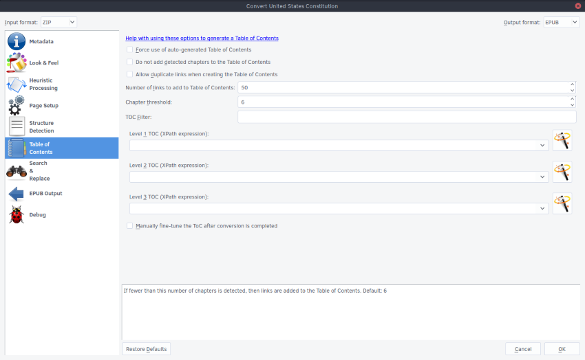接下来,我们会创建一个内容目录。如果不打算在你的书中使用目录,你可以跳过这个步骤。选中“内容目录Table of Contents” 标签。接下来,点击“一级目录Level 1 TOC (XPath expression)”右边的魔术棒图标。