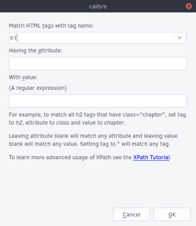 在这个新的窗口中,在“匹配 HTML 标签Match HTML tags with tag name”下的下拉菜单中选择“h1”。点击“OK” 来关闭这个窗口。如果你有子章节,在“二级目录(Level 2 TOC XPath expression)”下选择“h2”。