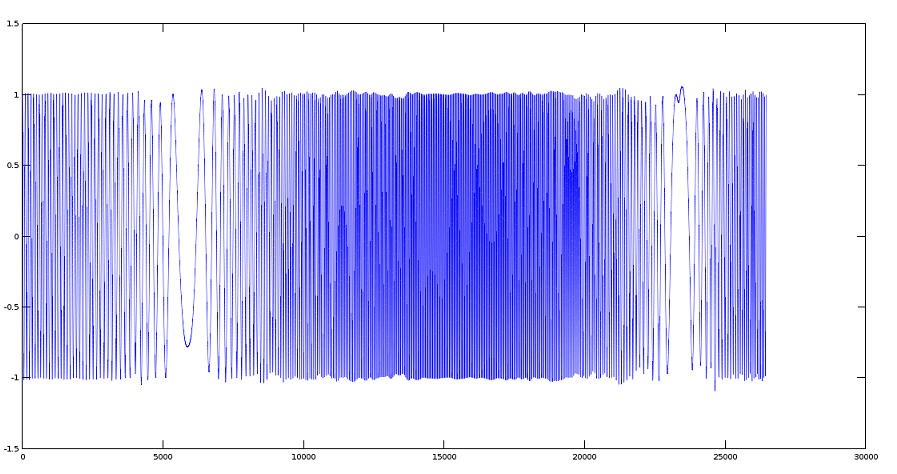 >> fm='fm.ogg';>> fs=44100;>> t=0:1/fs:10;>> w=2*pi*442*t;>> audiowrite(fm, cos(cos(w/1500).*w), fs);>> [y,fs]=audioread('fm.ogg');>> figure (); plot (y);