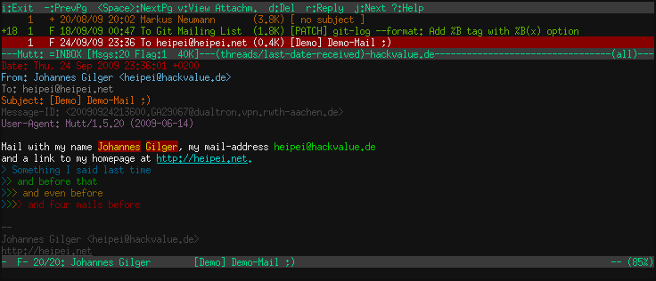 Mutt 是一个 Linux/UNIX 终端环境下的开源的邮件客户端。Mutt 以及 Alpine 在 Linux 命令行爱好者中有着最忠诚的追随者,这不是没有原因的。想一下你所期待邮件客户端应有的功能,Mutt 拥有:多协议支持(例如,POP3、IMAP 和 SMTP),S/MIME 和 PGP/GPG 集成,会话线索,颜色标记,可定制宏/快捷键,等等。另外,基于命令行的 Mutt 相比粗重的基于浏览器的邮件客户端(如:Gmail,Ymail)或图形用户界面的邮件客户端(如:Thunderbird,MS Outlook)而言,是一个使用电子邮件的轻量级替代品。