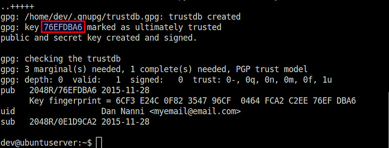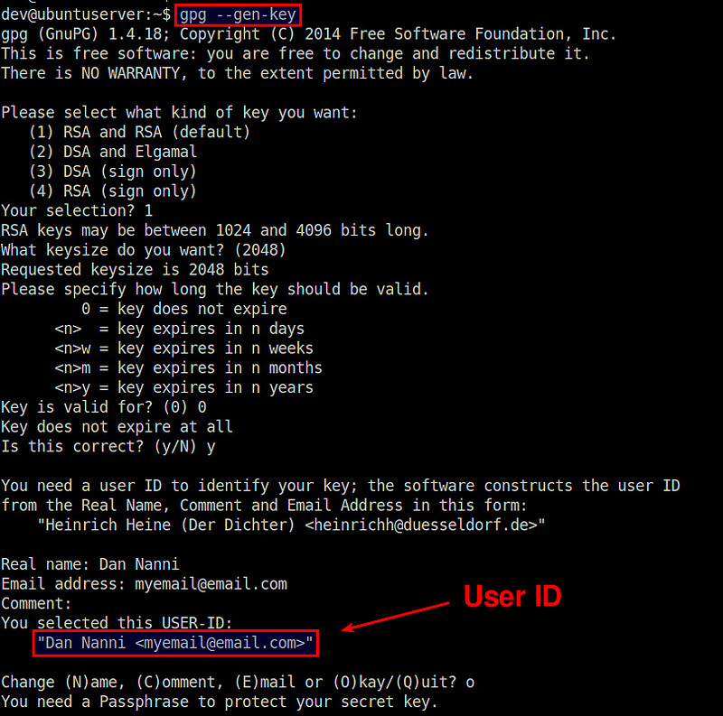 选择密钥类型(RSA),密钥长度(2048 bits),和过期时间(0 代表不过期)。当出现用户 ID 提示时,输入关联到该公钥/私钥对的名字(Dan Nanni) 和邮箱地址(myemail@email.com)。最后,输入一个密码来保护你的私钥。