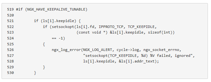 从TCP层面Nginx不仅要和Client关心KeepAlive,而且还要和Upstream关心KeepAlive, 同时从HTTP协议层面,Nginx需要和Client关心Keep-Alive,如果Upstream使用的HTTP协议,还要关心和Upstream的Keep-Alive,总而言之,还比较复杂。所以搞清楚TCP层的KeepAlive和HTTP的Keep-Alive之后,就不会对于Nginx的KeepAlive设置错。我当时解决这个问题时候不确定Nginx有配置TCP keepAlive的选项,于是我打开Ngnix的源代码,在源代码里面搜索TCP_KEEPIDLE,相关的代码如下: