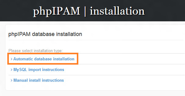 我们可以使用浏览器来完成phpIPAM的安装。将浏览器地址指向URL: http:///phpIPAM,将会显示以下phpIPAM安装页面。我们可以开始自动化数据库安装。