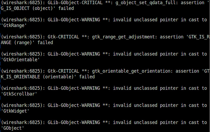 (wireshark:3480): GLib-GObject-WARNING **: invalid unclassed pointer in cast to 'GObject' (wireshark:3480): GLib-GObject-CRITICAL **: g_object_set_qdata_full: assertion 'G_IS_OBJECT (object)' failed (wireshark:3480): GLib-GObject-WARNING **: invalid unclassed pointer in cast to 'GtkRange' (wireshark:3480): Gtk-CRITICAL **: gtk_range_get_adjustment: assertion 'GTK_IS_RANGE (range)' failed (wireshark:3480): GLib-GObject-WARNING **: invalid unclassed pointer in cast to 'GtkOrientable' (wireshark:3480): Gtk-CRITICAL **: gtk_orientable_get_orientation: assertion 'GTK_IS_ORIENTABLE (orientable)' failed (wireshark:3480): GLib-GObject-WARNING **: invalid unclassed pointer in cast to 'GtkScrollbar' (wireshark:3480): GLib-GObject-WARNING **: invalid unclassed pointer in cast to 'GtkWidget' (wireshark:3480): GLib-GObject-WARNING **: invalid unclassed pointer in cast to 'GObject' (wireshark:3480): GLib-GObject-CRITICAL **: g_object_get_qdata: assertion 'G_IS_OBJECT (object)' failed (wireshark:3480): Gtk-CRITICAL **: gtk_widget_set_name: assertion 'GTK_IS_WIDGET (widget)' failed