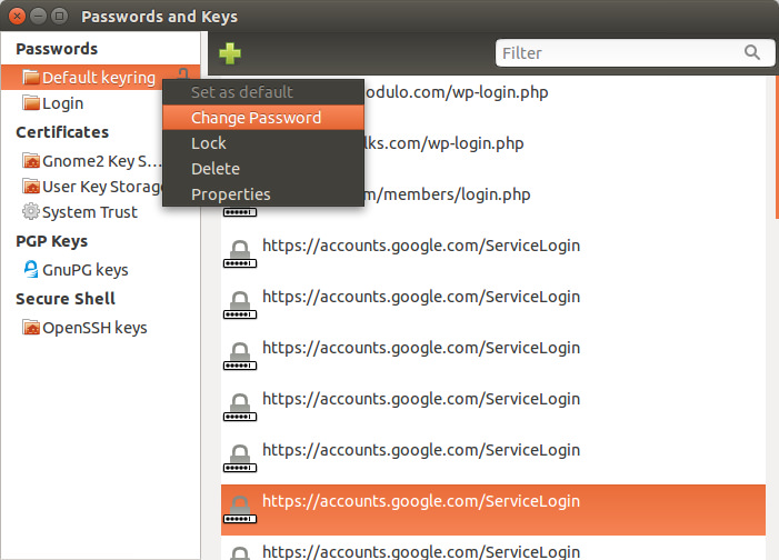 在左侧面板中,右击“默认密钥环”,并选择“修改密码”。
