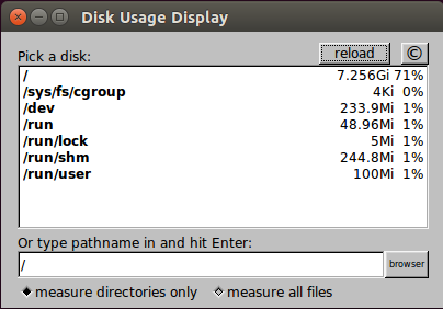 图形化地展示磁盘使用情况的 du。xdiskusage 是一个用户友好型的程序,它将为你展示你所有磁盘的使用情况。 它是在 Phillip C. Dykstra 所写的 “xdu” 程序的基础上设计的。做了一些修改以使得它可以为你运行 “du”命令,并显示磁盘的剩余空间,并且假如你想清晰地了解你的磁盘空间都去哪儿了,它还可以生成一个 PostScript 格式的名为 display.xdiskusage 的文件。
