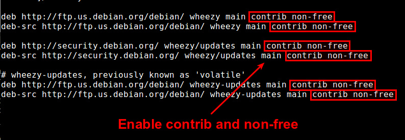 如果你想一直能够在Debian上安装闭源软件包,你需要添加contrib和non-free软件仓库。这样做,用文本编辑器打开 /etc/apt/sources.list 添加"contrib non-free""到每个源。