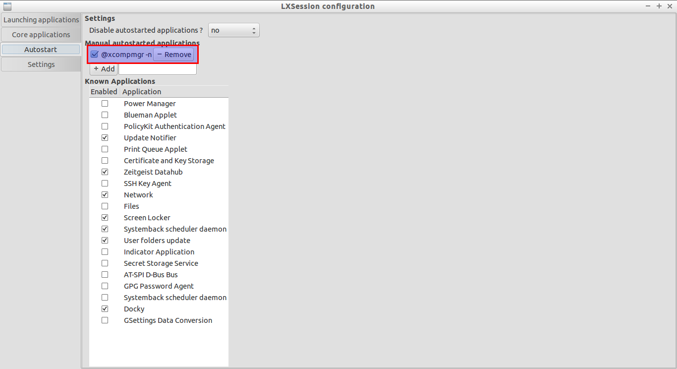然后,选择菜单(Menu) -> 偏好(Preferences) -> LXSession默认程序(Default applications for LXSession)。选择自动开始(Autostart)选项卡。 在(+增加)+Add框中输入“@xcompmgr -n”不带引号。最后点击增加按钮。