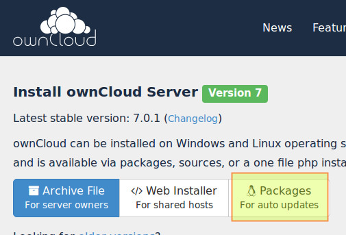 为当前的版本选择“Packages for auto updates”(下面的图是v7)。这可以让你轻松的让你使用的ownCloud与Debian的包管理系统保持一致,包是由ownCloud社区维护的。