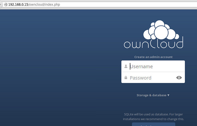 打开你的浏览器并定位到你的ownCloud实例中,地址是 http://服务器 IP/owncloud: