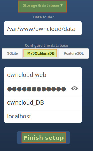 通过http://服务器 IP/owncloud 进入ownCloud页面,并选择‘Storage & database’ 选项。输入所需的信息(MySQL/MariaDB用户名,密码,数据库和主机名),并点击完成按钮。