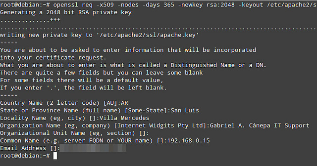 # openssl req -x509 -nodes -days 365 -newkey rsa:2048 -keyout /etc/apache2/ssl/apache.key -out /etc/apache2/ssl/apache.crt