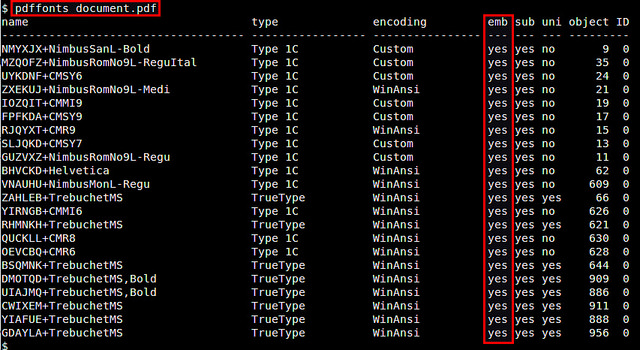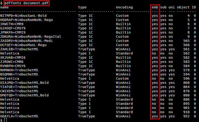 当你从LaTex中生成PDF文档时(例如用pdflatex或dvipdfm),可能并不是所有的字体都嵌入在PDF文档中。例如,pdffonts下面的输出中提示PDF文档中有缺少的字体(如Helvetica)。