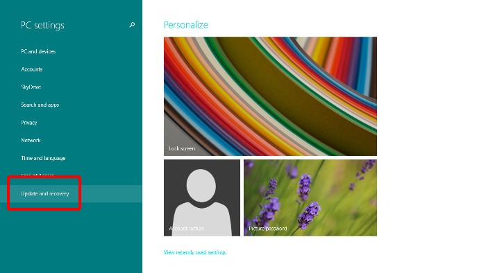 Window 8.1的:在 Windows8.1,从左侧边栏点击更新和恢复: