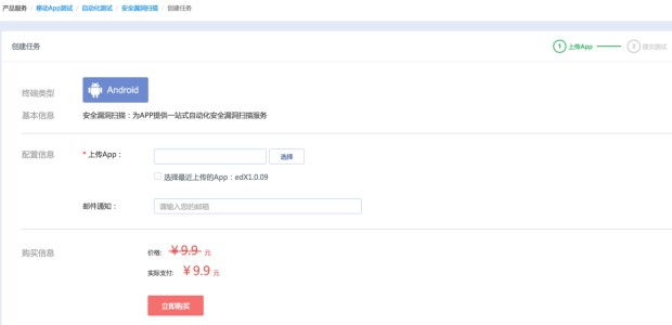 当然这里的专业版不仅仅可以是在界面上操作的版本,同时还提供API接口形式。这种方式对开发来说其实更方便,特别是有大量应用或者边修改边扫描漏洞的场景。这种收费模式来看,阿里云的移动安全应该是针对企业客户来制定的,而且相比其他的产品有这种线上售卖的流程也很方便。