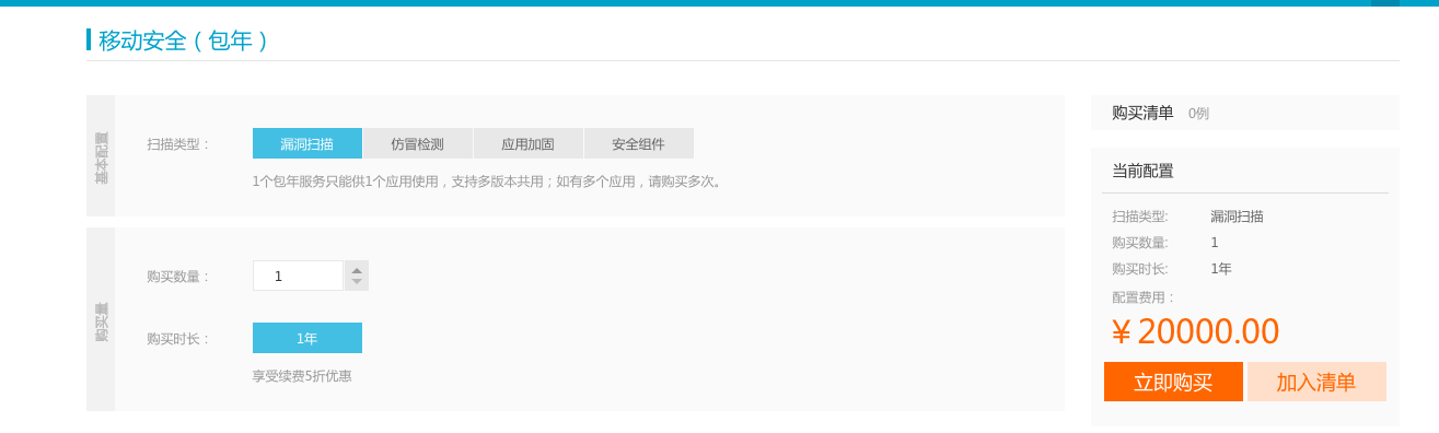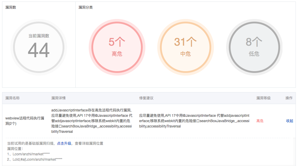 这款产品应该新出的,仔细研究下它的收费模式。在云盾中开通移动安全服务后可以免费试用基础版。不过基础版想到与阉割版。那漏洞扫描来说,基础版是看不到应用漏洞的具体位置的,只有点击立即升级购买专业版后才可以看到信息。售卖方式想得也比较周到,有两种方式:专业版收费包年20000元不限定使用次数,按次1000元一次。